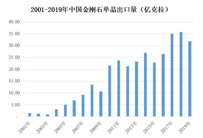 作为全球第一大人造金刚石生产国,中国人造金刚石产品得到越来越多国际客户的认可,金刚石单晶出口数量整体保持增长态势。