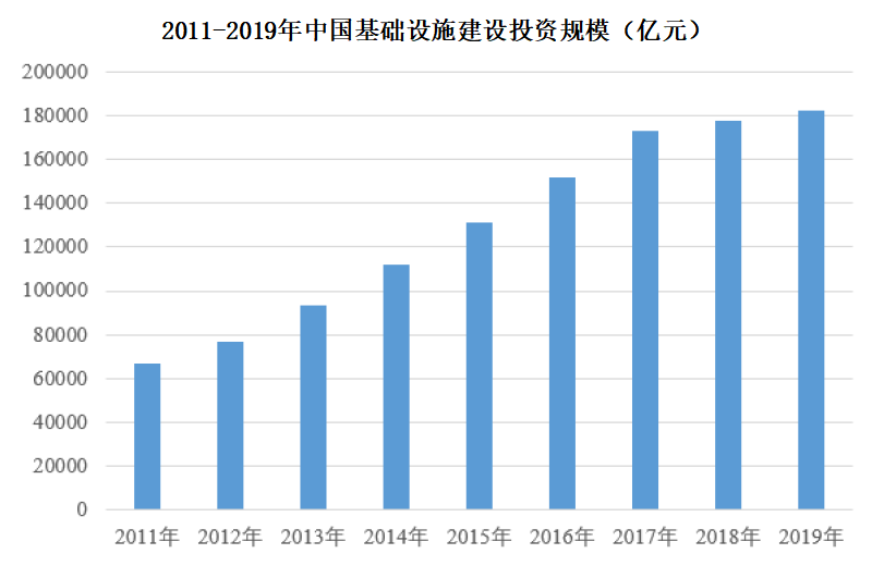 据国家统计局数据测算,中国基础设施建设投资规模自2011年的6.69万亿元增长至2019年18.21万亿元,年复合增长率为13.32%。此外,“十四五”期间中国基础设施建设投资规模预计将达22万亿元。