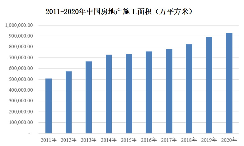 2011-2020年期间,中国房地产施工面积自50.8亿平方米增长至92.68亿平方米,年复合增长率为6.91%。
