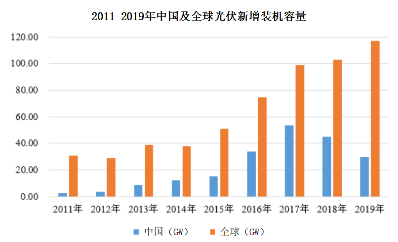 2019年,全球光伏市场新增装机规模达到116.9GW,再创历史新高,累计装机规模达到633.7GW。2011-2019年,全球光伏市场新增装机规模年复合增长率为18.05%,光伏发电成为全球增长速度最快的新能源品种。