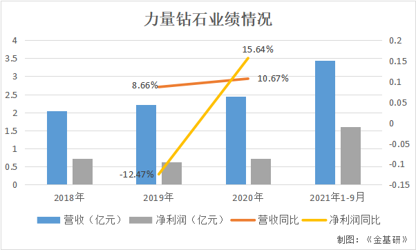 据东方财富Choice数据,2018-2020年及2021年1-9月,力量钻石分别实现营业收入2.04亿元、2.21亿元、2.45亿元、3.44亿元,2019-2020年及2021年1-9月增幅分别为8.66%、10.67%、106.89%。