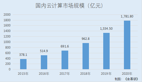 据中国信息通信研究院及中国互联网协会数据,2015-2020年,国内云计算市场规模分别为378.1亿元、514.9亿元、691.6亿元、962.8亿元、1,334.5亿元、1,781.8亿元。