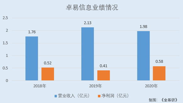 2018-2020年,卓易信息营业收入分别为1.76亿元、2.13亿元、1.98亿元,2019-2020年分别同比增长21.14%、-6.77%;净利润分别为0.52亿元、0.41亿元、0.58亿元,2019-2020年分别同比增长-20.36%、41.34%。