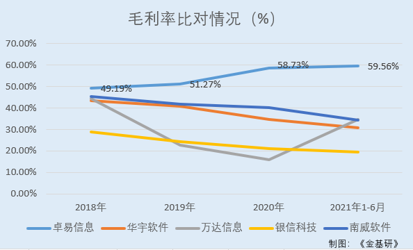 2018-2020年及2021年1-6月,卓易信息毛利率分别为49.19%、51.27%、58.73%、59.56%,另2021年1-9月卓易信息毛利率为56.93%。