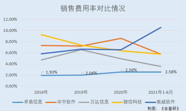 2018-2020年及2021年1-6月,卓易信息销售费用率分别为1.93%、2.04%、2.56%、2.58%,另2021年1-9月卓易信息销售费用率为2.1%。