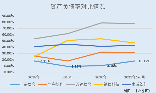 同期,卓易信息同行业可比公司华宇软件的资产负债率分别为25.96%、17.99%、32.2%、31.29%;万达信息的资产负债率分别为53.26%、61.75%、78.7%、78.07%;银信科技的资产负债率分别为24.95%、50.67%、53.34%、46.49%;南威软件的资产负债率分别为41.01%、44.73%、41.21%、42.94%。