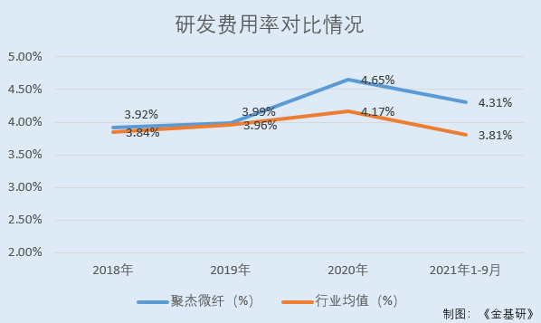 在研发投入方面,聚杰微纤的研发费用率常年超过3%。