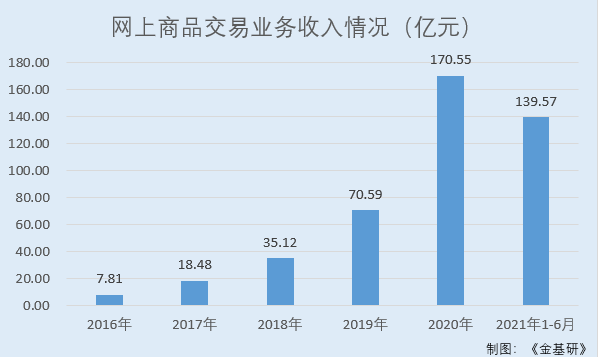 2016-2020年及2021年1-6月,国联股份网上商品交易业务收入分别为7.81亿元、18.48亿元、35.12亿元、70.59亿元、170.55亿元、139.57亿元。