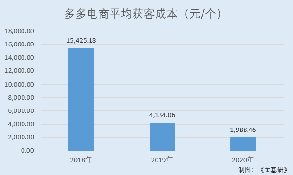 2018-2020年,多多电商平均获客成本分别为15,425.18元/个、4,134.06元/个、1,988.46元/个。