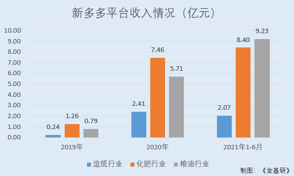 到2021年上半年,肥、纸、粮油多多收入分别为8.4亿元、2.07亿元、9.23亿元,增速分别为309.46%、137.61%、380.78%,净利润增速分别为351.37%、273.59%、689.7%。