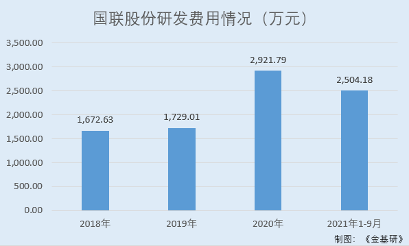 2018-2020年及2021年1-9月,国联股份研发费用分别为1,672.63万元、1,729.01万元、2,921.79万元、2,504.18万元。