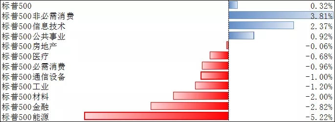 上周,标普500指数整周上涨0.32%,其覆盖的11个行业板块中,有3个上涨、8个下跌。其中,非必须消费、信息技术、公共事业板块涨幅居前;能源、金融等板块回调。
