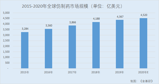 根据前瞻产业研究院数据,2015-2020年,全球仿制药市场规模分别为3,284亿美元、3,560亿美元、3,866亿美元、4,188亿美元、4,367亿美元、4,520亿美元。