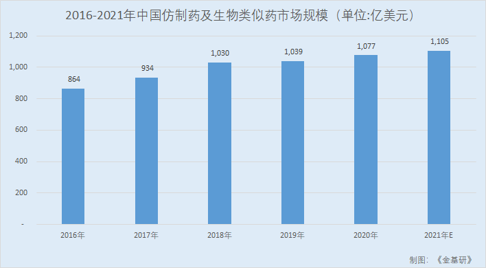 根据前瞻产业研究院数据,2016-2020年国内仿制药及生物类似药市场规模分别为864亿美元、934亿美元、1,030亿美元、1,039亿美元、1,077亿美元。