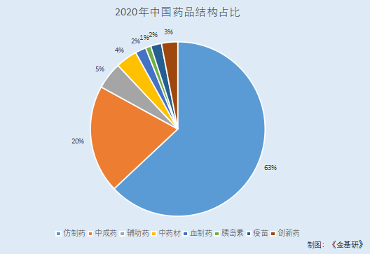 根据前瞻产业研究院数据,2020年国内药品按结构分类为仿制药、中成药、辅助药、中药材、血制药、胰岛素、疫苗、创新药,占比分别为63%、20%、5%、4%、2%、1%、2%、3%。