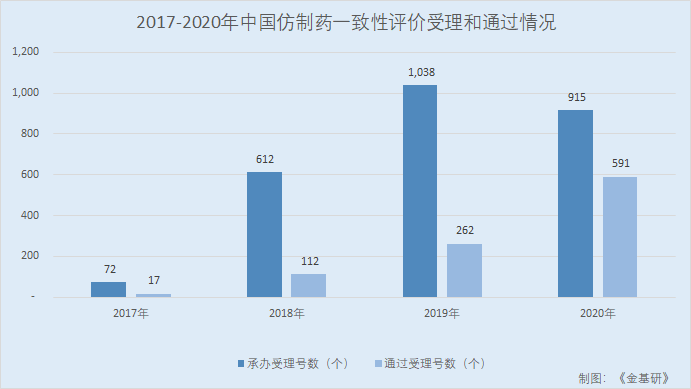 截至2020年,国内已上市仿制药一致性评价受理号总数达到2,636个,注射剂一致性评价受理总数1,047个。2020年,仿制药一致性评价承办的受理号共计915个,通过的受理号数为591个;截至2020年,视同通过仿制药一致性评价的受理号累计达到724个,2020年,新增视同通过一致性评价受理号532个,共计192个品种。