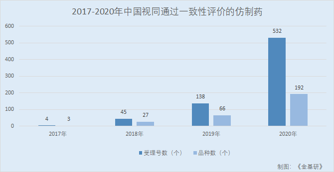此外,2017-2020年,国内视同一致性评价(按化学药品新注册分类批准的仿制药)的仿制药受理号数分别为4个、45个、138个、532个。同期,品种数分别为3个、27个、66个、192个。