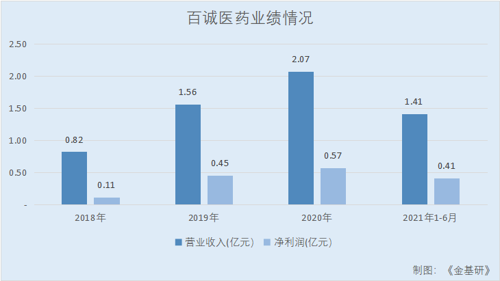 2018-2020年及2021年1-6月,百诚医药的营业收入分别为0.82亿元、1.56亿元、2.07亿元、1.41亿元,年复合增长率达到58.86%,2021年1-6月营业收入同比增长74.11%。