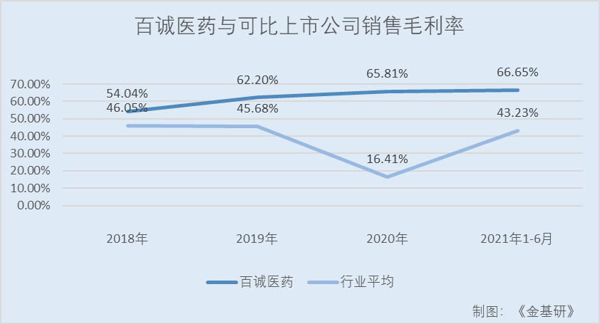 据东方财富Choice数据,2018-2020年及2021年1-6月,上述可比上市公司的销售毛利率均值分别为46.05%、45.68%、16.41%、43.23%。同期,百诚医药的销售毛利率分别为54.04%、62.2%、65.81%、66.65%。