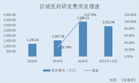 据东方财富Choice数据,2018年-2021年1-6月,百诚医药持续加大研发投入,研发费用分别为1,236.14万元、1,567.28万元、3,350.21万元和2,922.96万元。2019-2020年研发费用增速分别为26.78%、113.76%,呈现持续高速增长趋势。