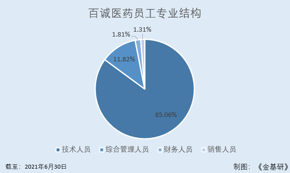 截至2021年6月30日,百诚医药技术人员、综合管理人员、财务人员、销售人员分别有518人、72人、11人、8人,分别占比85.06%、11.82%、1.81%、1.31%。