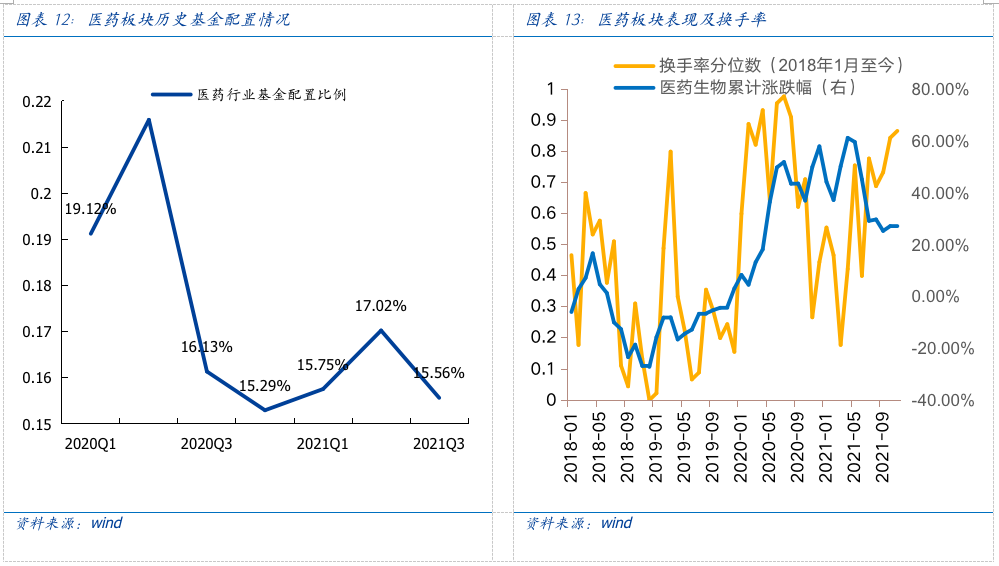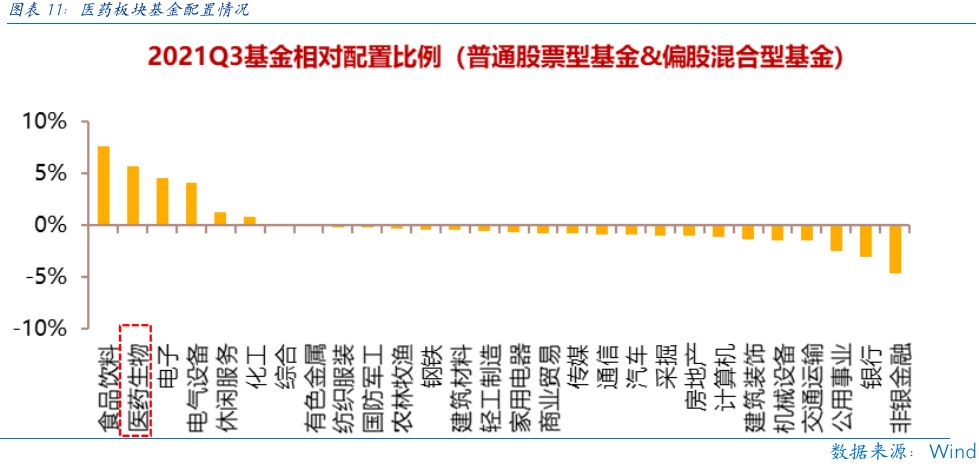 医药是公募基金的主要持仓赛道,因此长期超配,但目前相对历史超配比例较低。2021年Q3医药行业基金配置比例为15.56%,超配比例为5.73%,相较于2020-2021其它季度基金配置处于较低水平。