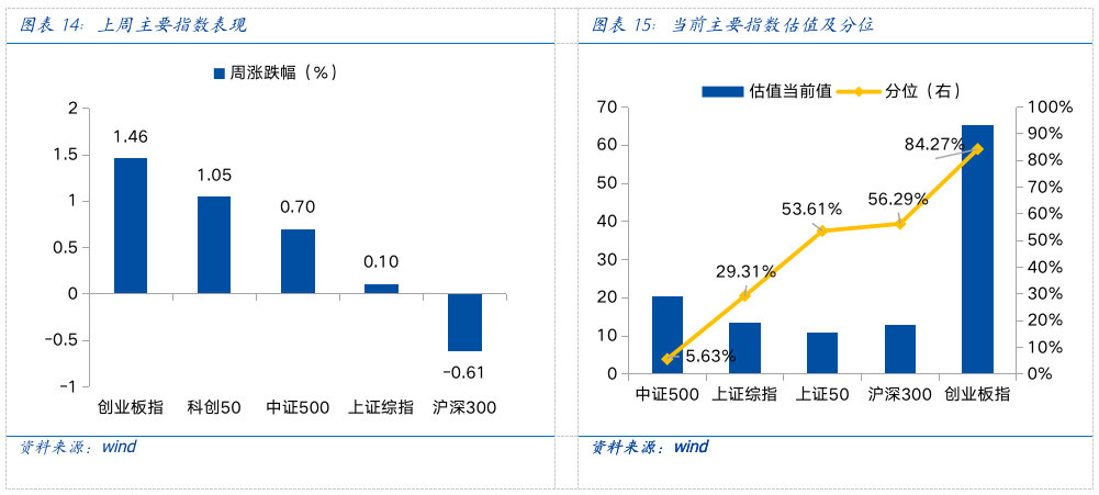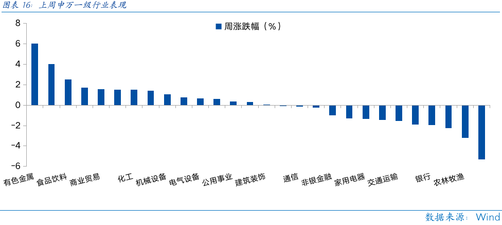 近一周,上证指数上涨0.1%,沪深300下跌0.61%,创业板指上涨1.46%,科创50上涨1.05%。风格上,周期、消费表现相对较好,金融、稳定表现较差。从申万一级行业看,表现相对靠前的是有色金属(6%)、钢铁(4.04%)、食品饮料(2.5%)、医药生物(1.69%)、商业贸易(1.58%);表现相对靠后的是休闲服务(-5.29%)、农林牧渔(-3.19%)、国防军工(-2.23%)、银行(-1.94%)、传媒(-1.88%)。