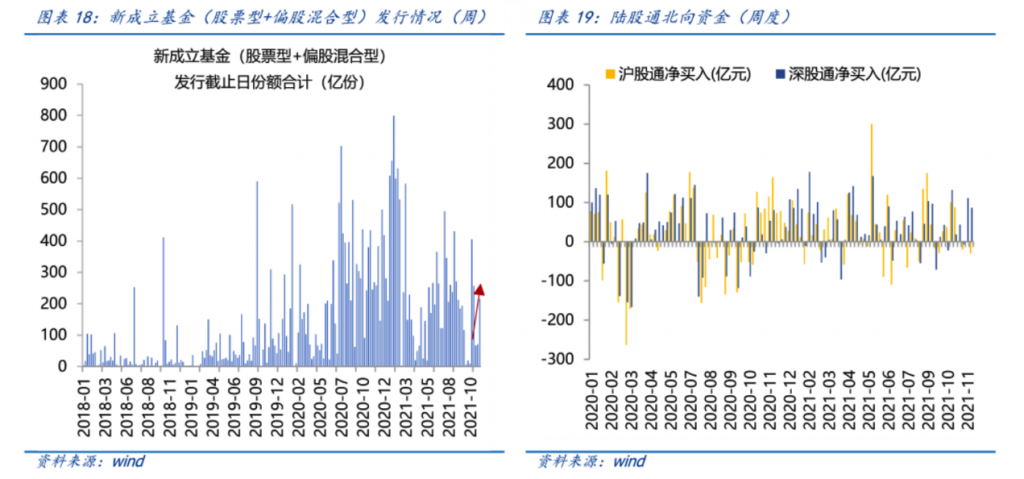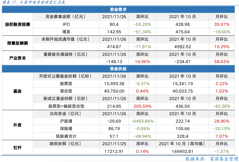 近一周,资金需求方面,IPO规模为80.4亿元,较上周减少55.2%,增发募集规模为142.95亿元,较上周减少51.34%;限售股解禁市值为474.87亿元,周环比为-71.81%,重要股东减持148.13亿元,较上周减少16.96%。资金供给方面,近一周新发股票型和偏股混合型基金规模合计为214.85亿元,去年同期为383.88亿元,同比回落44.4%,较年内高点回落73%;北向资金本周净流入57.1亿元,较上周减少48.94%,截至11月26日,北向资金11月累计净流入186.17亿元。截至11月25日,融资余额为17212.91亿元,较上周环比上升0.14%。