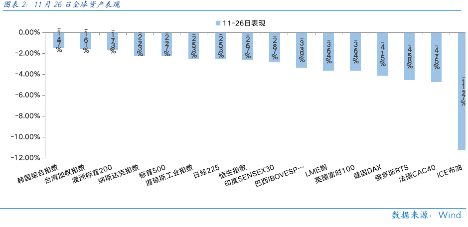 由于变异毒株奥密克戎极强的传播力,其引发全球市场巨幅波动,A股则有“惊”无险,其背后可能反映的是欧美抗疫模式的制度性困境。美股的道指、纳指分别跌2.53%和2.23%,欧洲的法国CAC40、德国DAX和英国富时100分别跌4.75%、4.15%和3.64%,都为近半年最大单日跌幅。商品方面,和经济复苏强相关的ICE布油跌11.27%,直接回到今年9月初的价格水平。当晚代表中国市场的A50期货仅下跌0.2%,表现强势。这一定程度可以映射周一的A股会有波动,但幅度或许可控。