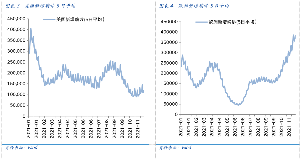 欧美的“疫苗+特效药+开放”的抗疫模式在毒株奥密克戎传播以前已经有一定“瑕疵”,毒株奥密克戎则提高了冬季新一轮疫情到来的置信度。欧美新增确诊人数已经在拐头向上,特别是欧洲的新增确认(5日平均)已经从低位5万人上升至40万人左右,新一轮疫情已经在酝酿,而毒株奥密克戎的高传播力或使得欧美冬季疫情重启难以避免,而欧洲当前疫情防控更差,疫情重启的置信度更高,故欧洲股市在上周五跌幅也更大。
