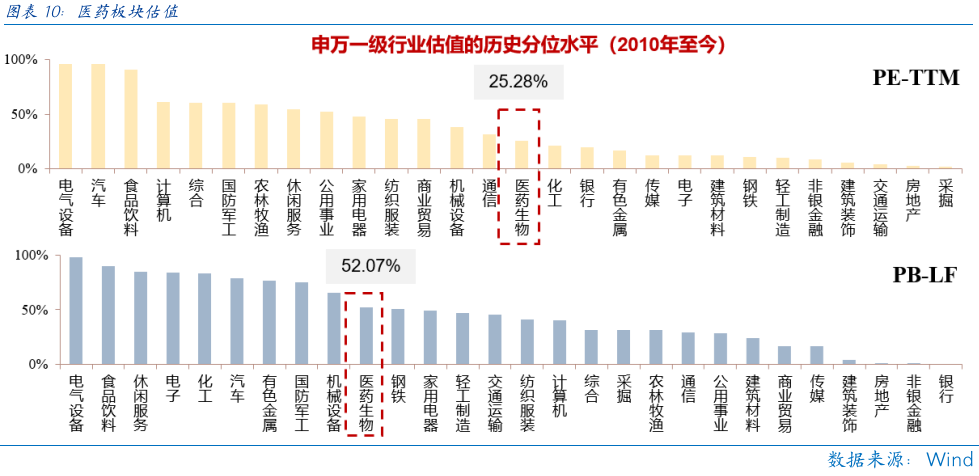 估值而言,PE(TTM)为35.02倍,处于2010年至今的25.28%分位;PB(LF)为4.34倍,处于2010年至今的52.07%分位。估值绝对和相对水平均低,也在确认医药当前的高胜率。