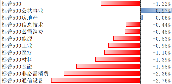 上周,标普500指数整周下跌1.22%,其覆盖的11个行业板块中,有2个上涨、9个下跌。其中,公共事业、房地产板块涨幅居前;通信设备、非必须消费、金融等板块回调明显。