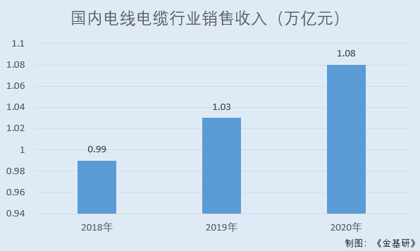 据前瞻产业研究院数据,2018-2020年,国内电线电缆行业销售收入分别为0.99万亿元、1.03万亿元、1.08万亿元。