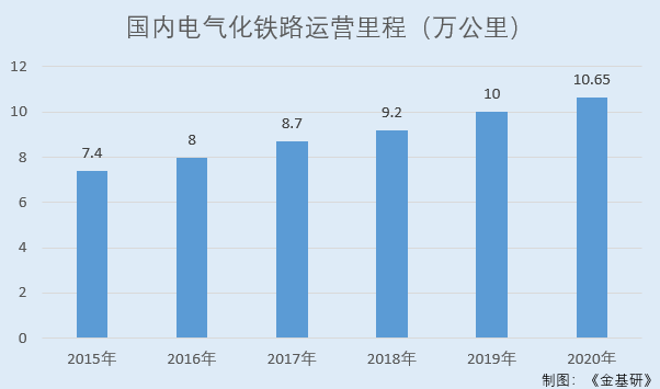 2015-2020年,国内电气化铁路运营里程分别为7.4万公里、8万公里、8.7万公里、9.2万公里、10万公里、10.65万公里。