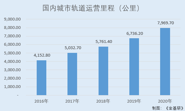 2016-2020年,国内城市轨道运营里程分别为4,152.8公里、5,032.7公里、5,761.4公里、6,736.2公里、7,969.7公里。