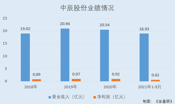 观其业绩,2018-2020年及2021年1-9月,中辰股份营业收入分别为19.02亿元、20.94亿元、20.54亿元、18.93亿元,2019-2020年及2021年1-9月分别同比增长10.13%、-1.9%、32.01%。其中,2020年营收下降系受新冠疫情影响。