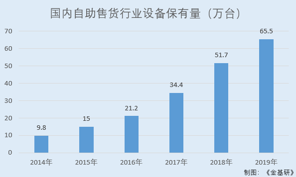 2014-2019年,国内自助售货设备行业保有量分别为9.8万台、15万台、21.2万台、34.4万台、51.7万台、65.5万台。