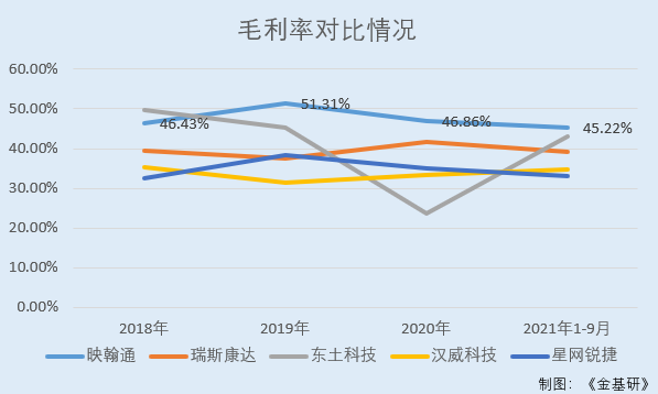 据东方财富Choice数据,2018-2020年及2021年1-9月,映翰通毛利率分别为46.43%、51.31%、46.86%、45.22%。