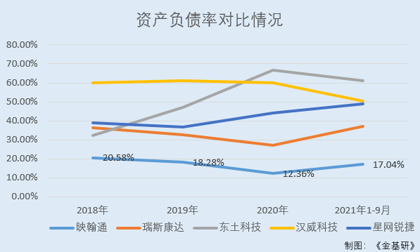 同期,映翰通同行业可比公司瑞斯康达的资产负债率分别为36.21%、32.78%、27.15%、36.88%;东土科技的资产负债率分别为32.43%、47.02%、66.75%、61.09%;汉威科技的资产负债率分别为60.17%、61.05%、59.89%、50.57%;星网锐捷的资产负债率分别为39.07%、36.78%、43.98%、49.07%。