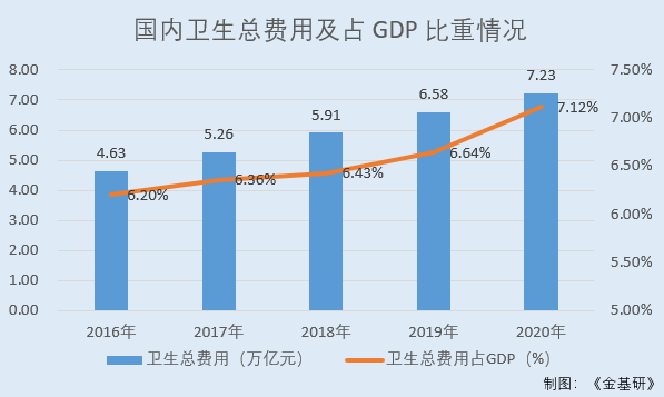 2016-2020年,国内卫生总费用分别为4.63万亿元、5.26万亿元、5.91万亿元、6.58万亿元、7.23万亿元,占GDP的比重分别为6.2%、6.36%、6.43%、6.64%、7.12%。