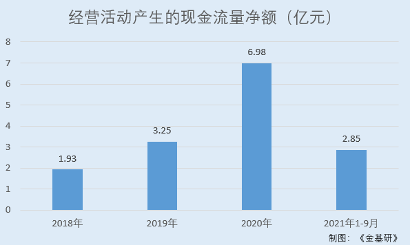 据东方财富choice数据,2018-2020年及2021年1-9月,悦康药业经营活动产生的现金流量净额分别1.93亿元、3.25亿元、6.98亿元、2.85亿元。