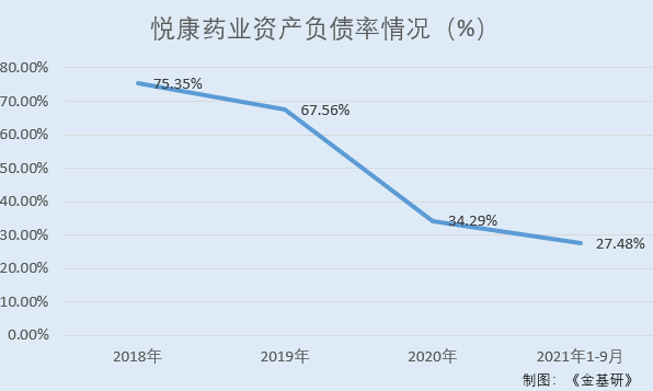 据东方财富choice数据,2018-2020年及2021年1-9月,悦康药业的资产负债率分别为75.35%、67.56%、34.29%、27.48%。