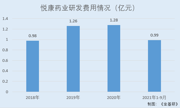 据东方财富Choice数据,2018-2020年及2021年1-9月,悦康药业的研发费用分别为0.98亿元、1.26亿元、1.28亿元、0.99亿元。