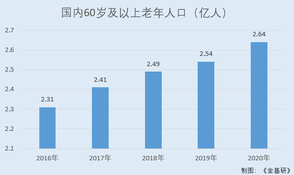 根据国家统计局数据统计,2016-2020年,国内60岁及以上老年人口分别为2.31亿人、2.41亿人、2.49亿人、2.54亿人、2.64亿人。