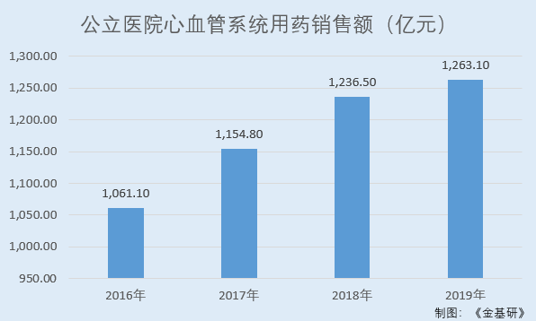 2016-2019年,公立医院心血管系统用药销售额分别为1,061.1亿元、1,154.8亿元、1,236.5亿元、1,263.1亿元。