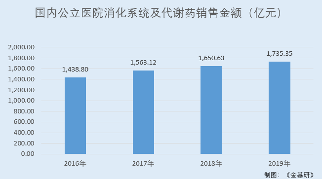 2016-2019年,国内公立医院消化系统及代谢药销售金额分别为1,438.8亿元、1,563.12亿元、1,650.63亿元、1,735.35亿元。