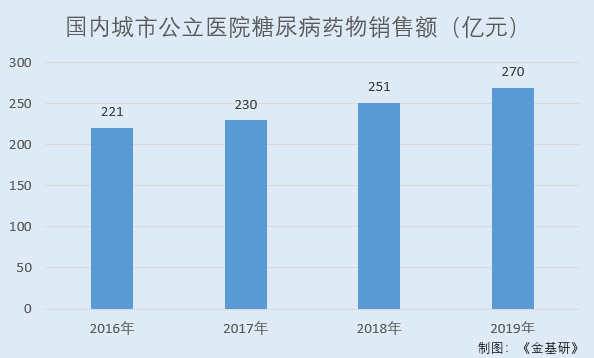 根据南方医药经济研究所统计数据的统计,2016-2019年,国内城市公立医院糖尿病药物销售额分别为221亿元、230亿元、251亿元、270亿元。