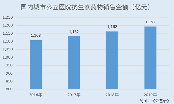 根据南方医药经济研究所统计数据的统计,2016-2019年,国内城市公立医院抗生素药物销售金额分别为1,108亿元、1,132亿元、1,162亿元、1,192亿元。