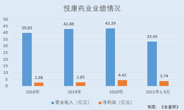 据东方财富choice数据,2018-2020年及2021年1-9月,悦康药业的营业收入分别为39.83亿元、42.88亿元、43.39亿元、33.45亿元,2019-2020年及2021年1-9月分别同比增长7.66%、1.2%、19.26%。