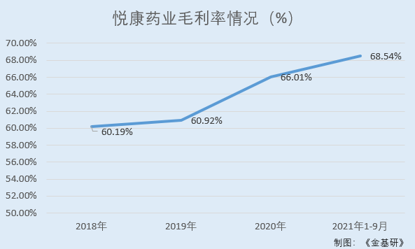 据东方财富choice数据,2018-2020年及2021年1-9月,悦康药业的毛利率分别为60.19%、60.92%、66.01%、68.54%。